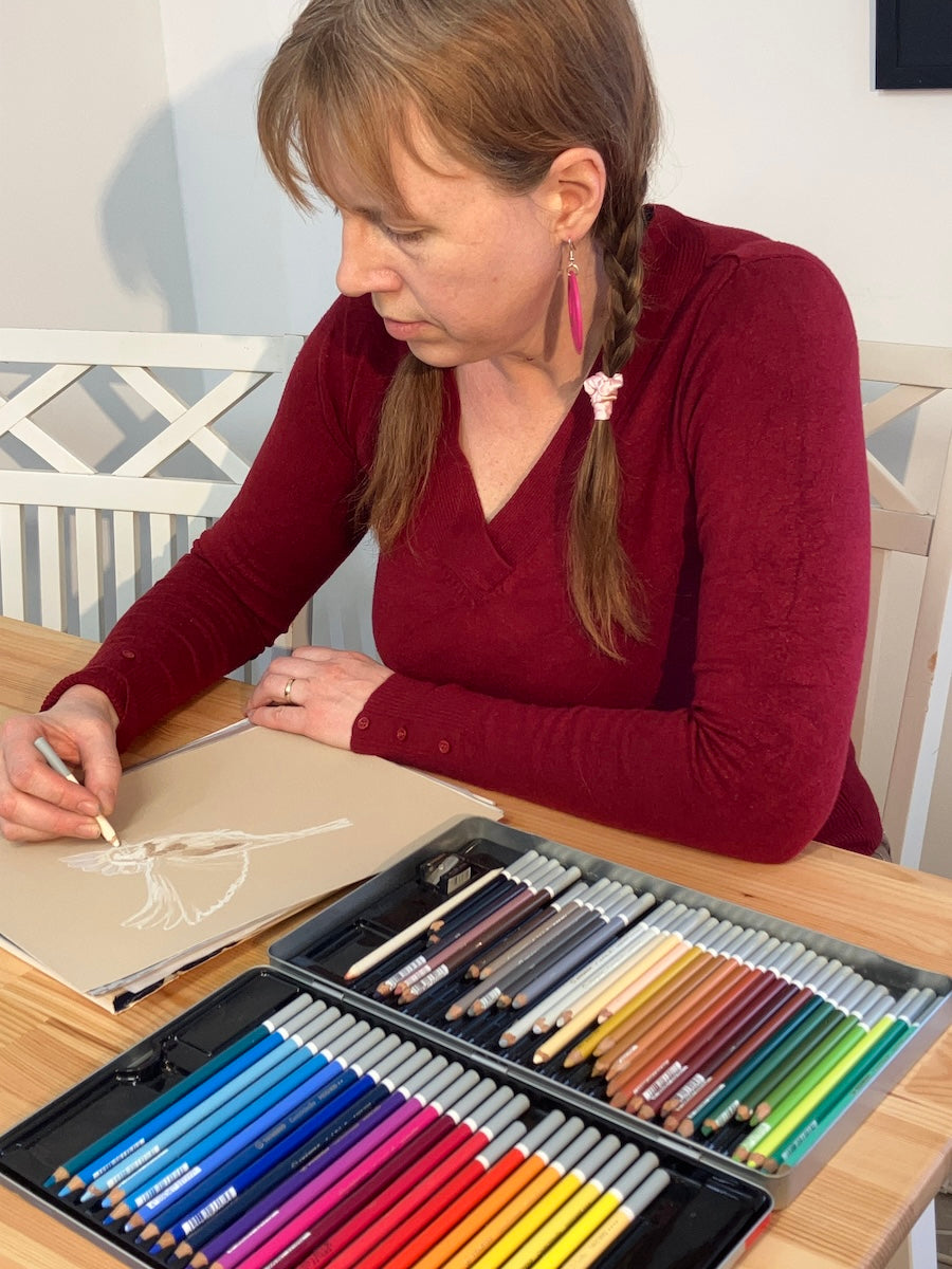 Numera är jag även utbildad trädgårdsanläggare så jag tillbringar fortfarande mycket tid i trädgårdar när jag inte ägnar mig åt att måla. Fåglar fascinerar mig, särskilt att fånga uttrycket hos de fåglar jag ser omkring mig varje dag när jag arbetar i trädgården eller tar en skogspromenad med barnen.